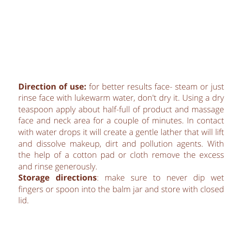 This balm is a fantastic blends of oils and clay that in contact with water drops will create a soft, creamy, soap-like lather for a deep cleanse and a gentle exfoliation. It will be sloughing away dull dead skin, absorbing impurities from your pores, brightening up the skin tone and leaving a wonderful soft feeling.